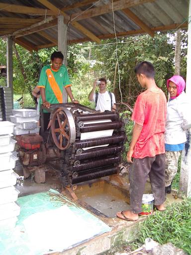 Squashing blocks of rubber into sheets, using mechanised 'mangle'